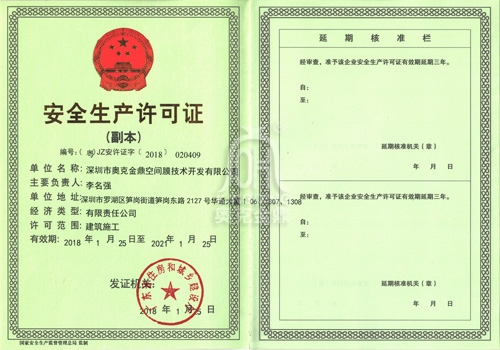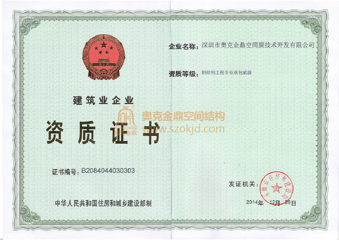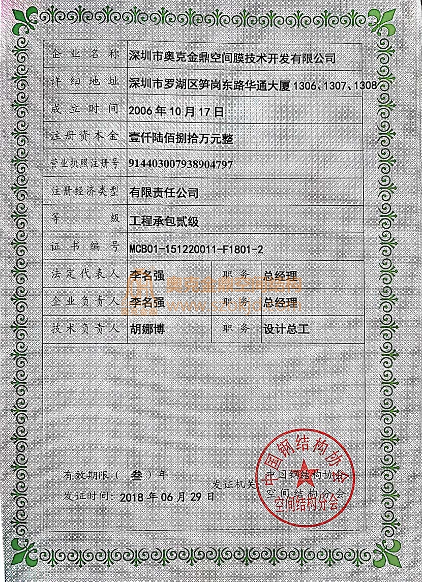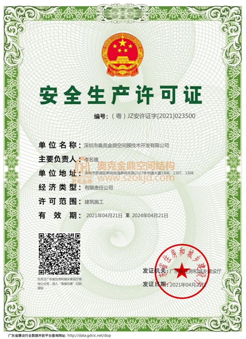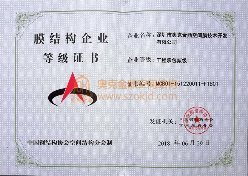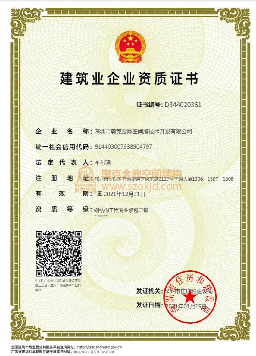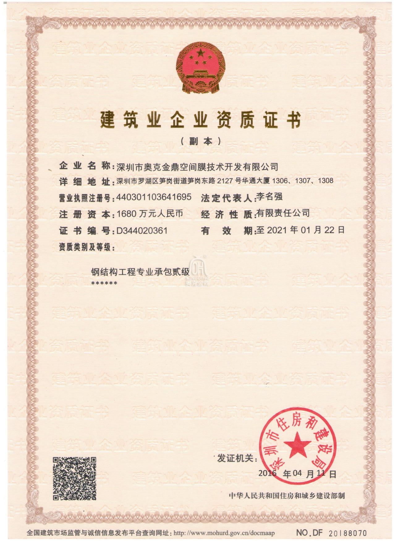 鋼結(jié)構(gòu)工程安裝貳級,膜結(jié)構(gòu)工程設(shè)計壹級,膜結(jié)構(gòu)工程施工壹級,具備安全生產(chǎn)許可證。